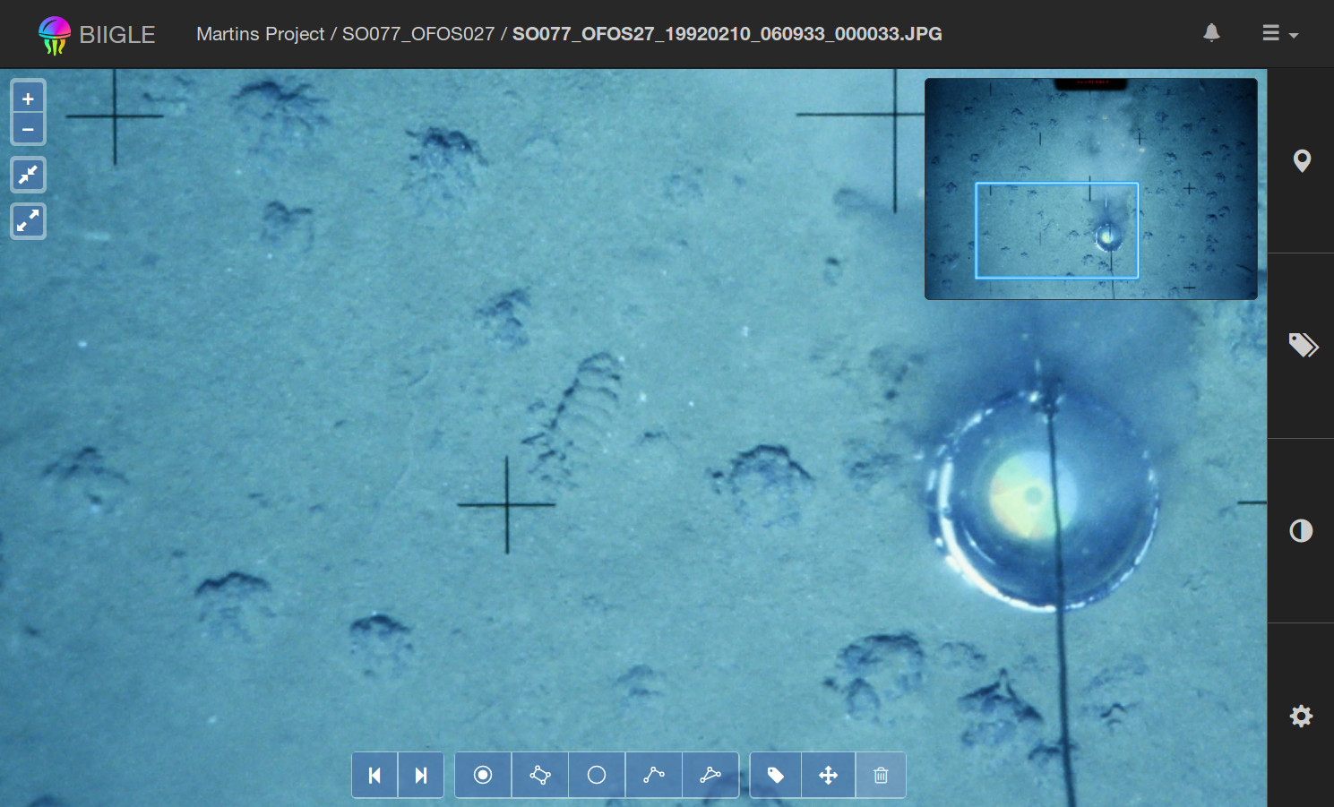 The main element of the image annotation tool is the image which you can navigate similar to an interactive map (like Google Maps). You can grab and move the image with the mouse or zoom in and out using the mouse wheel.