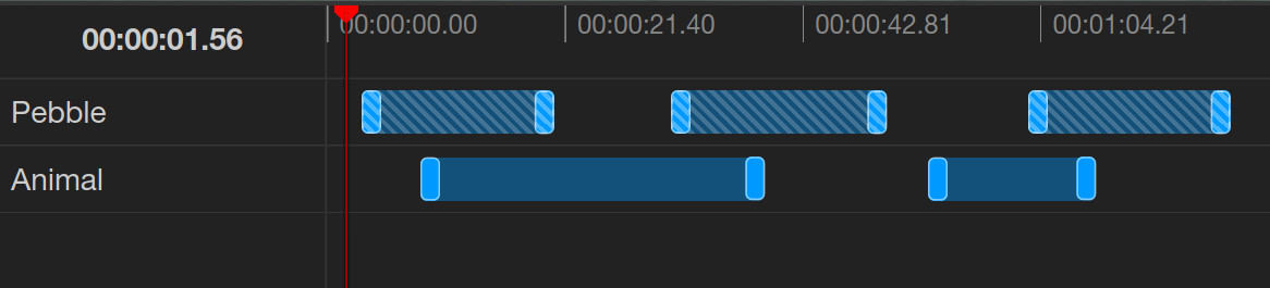 To apply automatic object tracking, create a single keyframe of a point or circle annotation clip that marks the object at the first point of time at which it is visible in the video. Now instead of finishing the annotation with the button, click the button. This creates the new annotation clip and starts object tracking in the background. A running object tracking is indicated by a keyframe element with a blinking red border in the timeline. Depending on the size of the video and the duration that the annotated object is visible, the object tracking can run for several minutes. The new annotation clip will automatically be updated when the object tracking has finished.